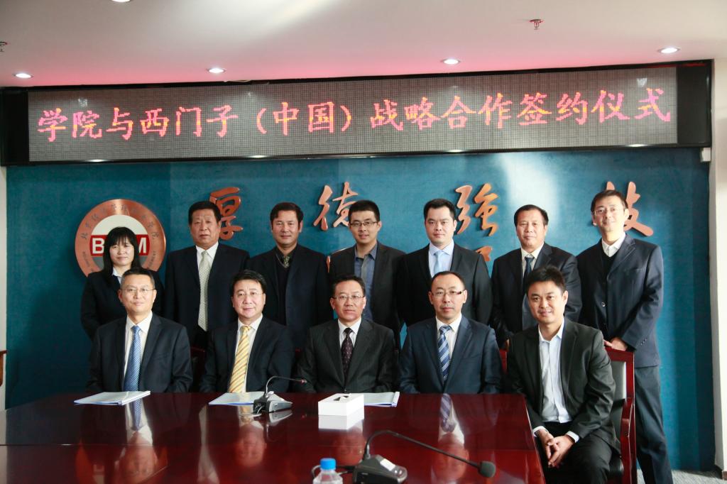 2015年10月26日,在望京校区309会议室召开了“北京经济管理职业学院与西门子(中国)战略合作伙伴协议签约仪式”。西门子(中国)有限公司工业销售副总裁李东,西门子数字化工厂集团及过程工业与驱动集团副总裁王涛,西门子(中国)有限公司北京销售总监李士光,西门子(中国)有限公司北京销售经理李晶麟,市场发展经理吕智,自动化教育合作项目经理蒙文强6人出席了签约仪式。我院参加签字仪式的有院长姚光业、副院长苏春林、教务处长候爱民、校办主任刘志东、bet364备用网址大全院长张振英、电气自动化技术专业主任周国娟共有6人。会议由苏院长主持,双方在融洽、愉快的氛围中就广泛、长期、稳定、深度、可持续发展的战略合作达成了共识。并签署了战略合作伙伴协议。