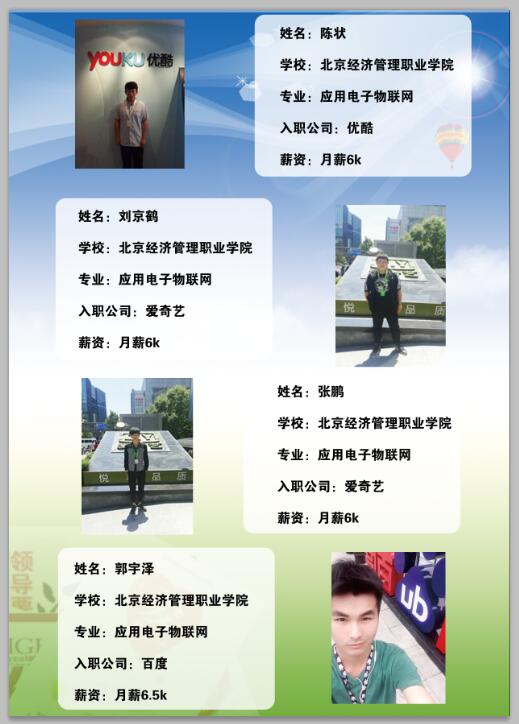 2013年应用电子技术专业加设物联网技术方向以来,迎来了首届毕业生。本届学生经过三年的学习,走入毕业季。经过企业严格的面试,有些同学进入了优酷、爱奇艺、百度等知名公司,入职薪金在6000元左右,如下图所示。